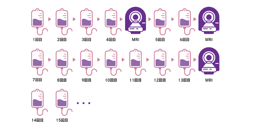 ・薬剤投与は点滴で行います。1回の投与は約30分~1時間かかります。