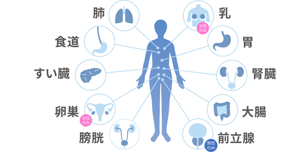 〇女性 : 69,300円(税込) 9種類(食道がん、胃がん、大腸がん、膵臓がん、肺がん、乳がん、卵巣がん、腎臓がん、膀胱がん)